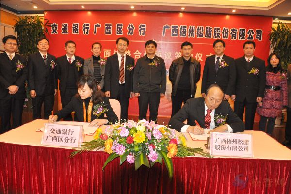 近日,交通銀行廣西區(qū)分行與廣西梧州松脂股份有限公司簽訂全面戰(zhàn)略合作協(xié)議,進一步加強銀企之間在資金、籌備上市等方面合作,促進梧州松脂產(chǎn)業(yè)發(fā)展壯大,加快廣西梧州松脂公司的上市進程,實現(xiàn)銀企合作雙贏。